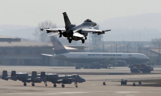 4月3日,一架美國空軍F-16戰斗機准備在韓國首都首爾以南烏山的一座美軍基地降落。