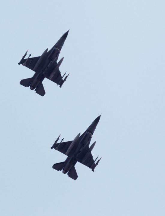 4月3日,兩架美國空軍F-16戰斗機從韓國首都首爾以南烏山的一座美軍基地上空飛過。