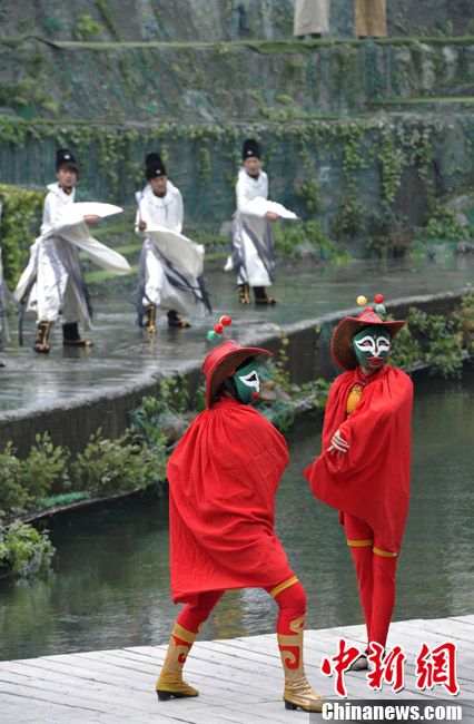 4月4日,四川都江堰市在清明放水節上舉行“拜水大典”,川劇藝術家在“拜水大典”上表演川劇絕活變臉。中新社發 安源 攝