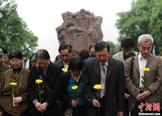 4月4日,重慶沙坪壩區歌樂山腳下紅岩魂廣場烈士墓前,武警官兵、醫務人員、機關工作人員、大學生等近千名社會各界人士一同緬懷64年前犧牲在歌樂山下的300多名革命烈士。60多年前,歌樂山腳下被關押的共產黨人和黨外革命志士面對嚴刑拷打不屈服,面對威逼利誘不動搖,面對死亡的威脅大義凜然,在爭取民族獨立和人民解放斗爭中作出貢獻和犧牲。圖為社會各界人士手執菊花烈士墓前默哀。陳超 攝