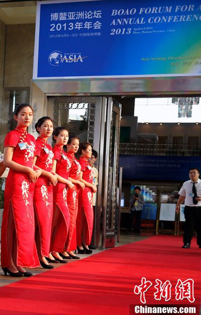 4月5日,海南博鳌亚洲论坛国际会议中心外,一群礼仪小姐列队欢迎八方来客。4月6日至8日,博鳌亚洲论坛2013年年会将在海南博鳌举行。中新社发 张浩 摄