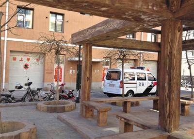 23日,事发百合新城小区楼下,停着一辆警车。李某某在这栋楼上买了一套房。新京报记者 王瑞锋 摄