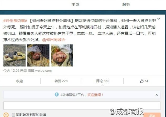 江苏邳州一老人被扔到野外等死,照片拍摄地在邳城镇泇口村。知情人称该老妇几天前被扔出,眼看着就这样被扔在林里,奄奄一息。经成都商报记者调查核实,邳城镇派出所工作人员称确有此事,已经解决。然而具体何事、如何解决,却不愿透露。(来源:成都商报)