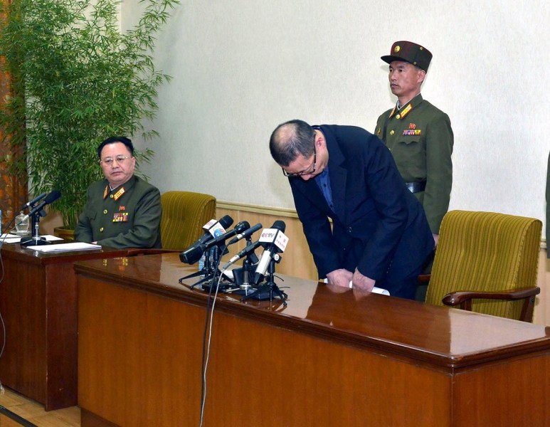 当地时间3月26日,朝鲜平壤,朝鲜举行发布会称,去年9月和12月逮捕了两名韩国间谍,这两名间谍受美韩两国指使,多次窃取朝鲜劳动党和国家情报、军事秘密等,并在朝鲜境内散发反朝宣传物,破坏朝鲜社会制度和稳定。图为当地时间3月26日,朝鲜平壤,一名被认为是韩国间谍的男子对自己进行间谍活动的事实供认不讳并公开道歉。