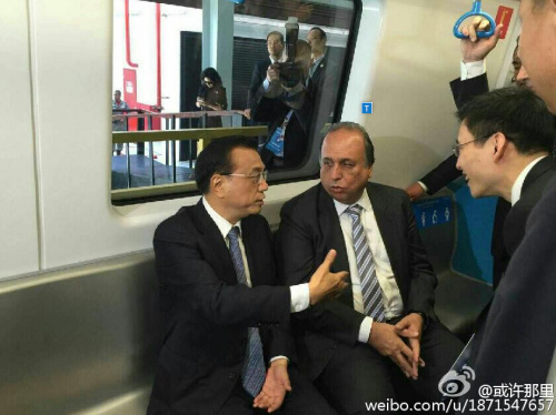 据网友透露,当地时间20日上午10时06分,“超级推销员”李克强总理现身巴西里约地铁公司,乘坐中国制造列车。