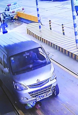 18日上午9时许,长沙县交警查获杜某民非法改装面包车。当警察对其车内非法改装的违法行为拍照证据时,杜某民将面包车钥匙仍在警车引荐盖上威胁交警不要对其处罚。见交警依然开具处罚决定书后,从警车上夺取面包车钥匙驾车故意冲撞交警。辅警粟某当即被撞倒在面包车的右前轮下。图为事发时的监控录像。