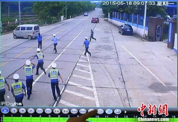 2015年5月18日上午9时许,湖南长沙县交警粟铁在查处一涉嫌非法改装车辆时,被撞倒拖行致重伤,目前,虽已脱离生命危险,但身体大面积刮伤,需要植皮手术。肇事司机杜某称,当天是带怀孕5个多月的妻子去做孕检。杜某已因涉嫌故意杀人被刑拘。图为事发时的监控录像。
