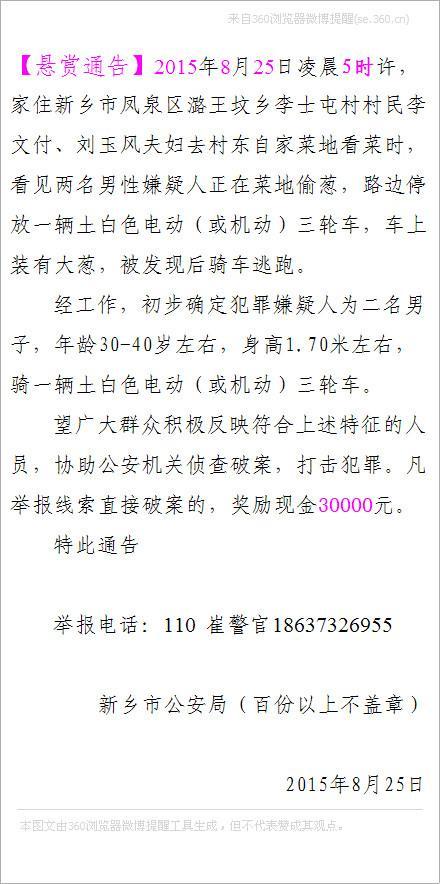 认证为河南新乡公安局民警的@民警刘会永发布一则悬赏通告,2015年8月25日凌晨5时许,家住新乡市凤泉区潞王坟乡李士屯村村民李文付、刘玉风夫妇去村东自家菜地看菜时,看见两名男性嫌疑人正在菜地偷葱,路边停放一辆土白色电动(或机动)三轮车,车上装有大葱……