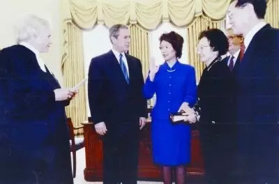 △2001年3月6日,赵小兰在美国白宫总统椭圆形办公室宣誓就任美国劳工部长。