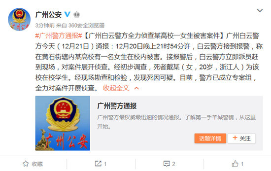 广州白云警方21日通报:20日晚21时54分许,白云警方接到报警,称在黄石街辖内某高校有一名女生在校内被害。接报警后,白云警方立即派员赶到现场,对案件展开侦查。经初步调查,死者戴某(女,20岁,浙江人)为该校在校学生。经现场勘查和检验,发现死因可疑。