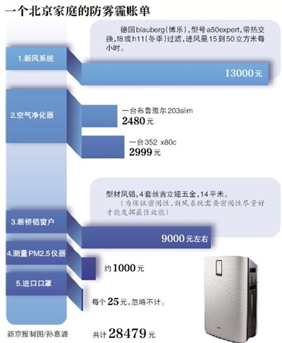 北京张先生一家对琳琅满目的净化器品牌选购充满困惑,国外品牌动辄几千甚至上万,而相对高性价比的互联网品牌用着能否安心?最终,他们根据和自己的研究,选择了防PM2.5口罩+空气净化器+新风系统+房屋密封,作为捍卫家庭成员呼吸健康的防护措施。张先生给新京报记者列出的账单显示,这个选择让他们花费了大约2.8万元。