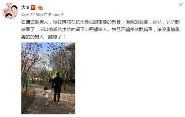 大S稍早在微博晒出汪小菲牵着女儿在公园散步的背影照,表示老公现在应该在杭州参加很重要的聚会,但因为她和2个孩子都感冒了,汪小菲便毅然决然的留下来照顾他们,“姑且不论我感动与否,这般重情重义的的男人,帅爆了!”