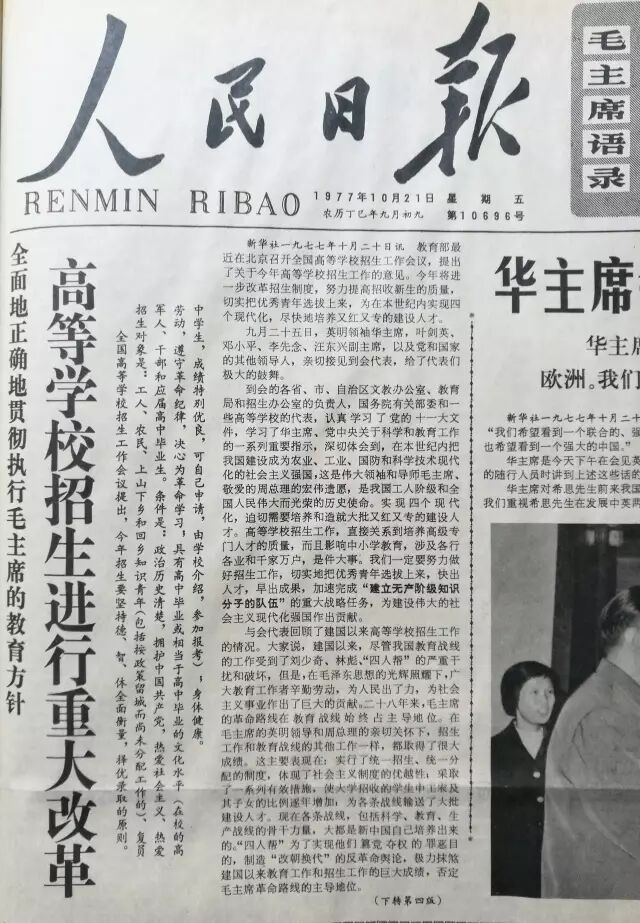 1977年10月21日,人民日报头版头条刊登《高等学校招生进行重大改革》的消息。