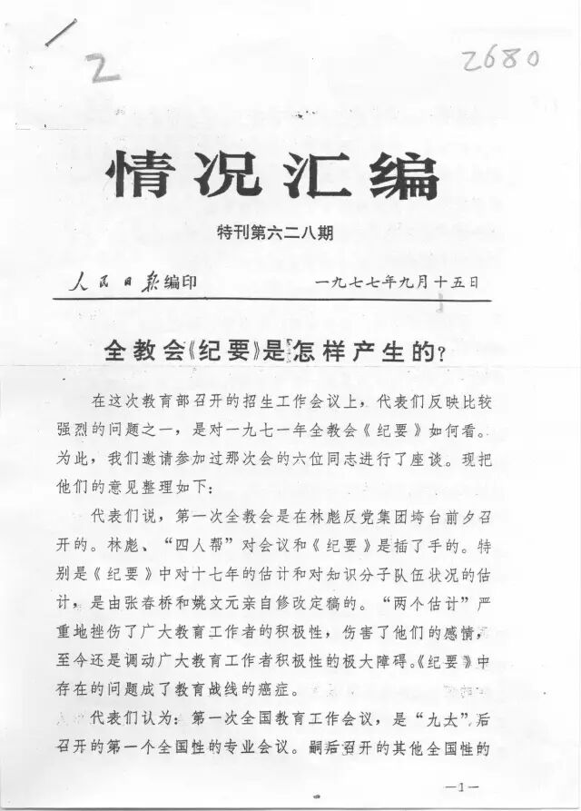 传达是依照文稿念的,一开始就是邓小平说:“最近人民日报记者找了6位参加过1971年全国教育工作会议的同志座谈,写了一份材料,讲了全国教育工作会议纪要产生的经过,很可以看看。”