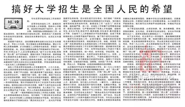 此后的进程犹如春江放筏。1977年10月21日,人民日报头版头条以《高等学校招生进行重大改革》为标题,报道刚刚结束的全国招生工作会议消息,宣布当年恢复统一高校入学考试,同一版面上发表了人民日报社论《搞好大学招生是全国人民的希望》。邓小平亲自审定这篇社论的送审稿。