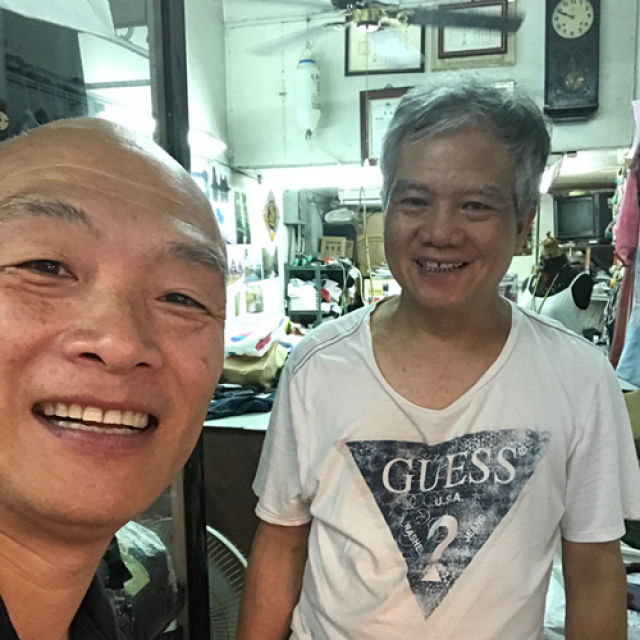 何自力(左)在台湾采访一家裁缝铺后与店主合影。