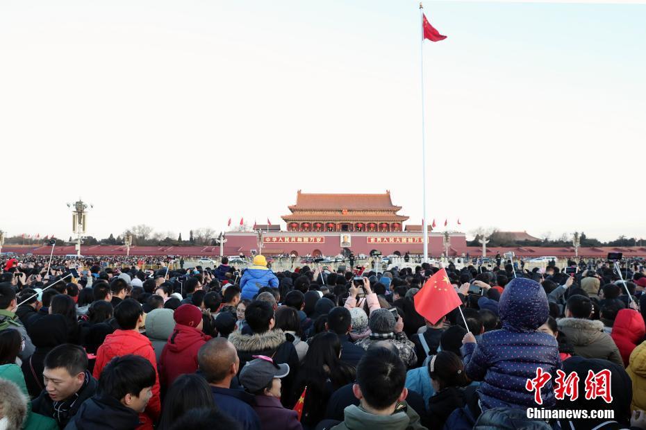 2018年1月1日清晨,北京天安门广场举行隆重的升国旗仪式。这是经党中央批准,自2018年1月1日起由人民解放军担负国旗护卫和礼炮鸣放任务后,解放军仪仗队和军乐团首次执行的升国旗仪式。数万民众观看升国旗仪式。中新社记者 盛佳鹏 摄