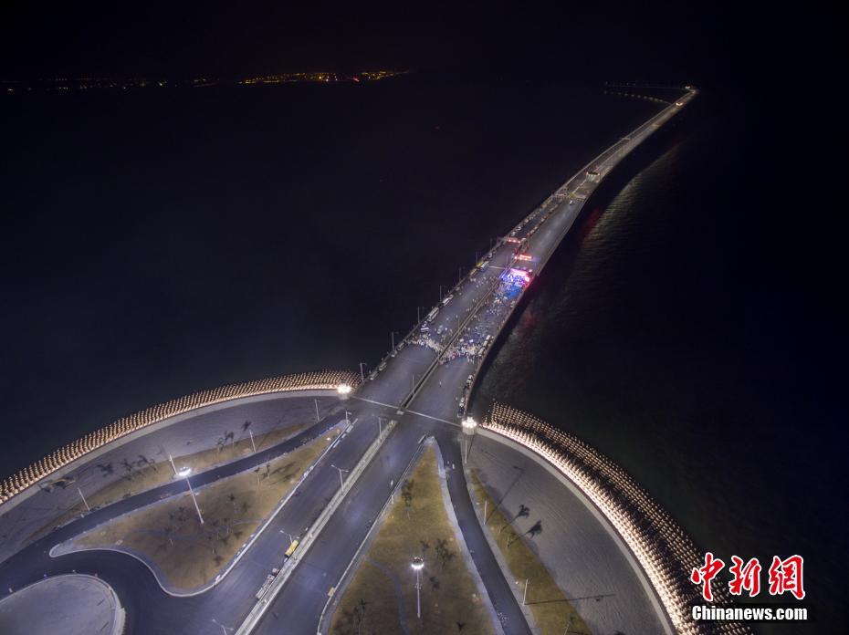 12月31日晚,港珠澳大桥全线亮灯,标志着全线供电照明系统施工圆满完成,意味着港珠澳大桥主体工程已经具备通车条件。中新社记者 廖树培 摄