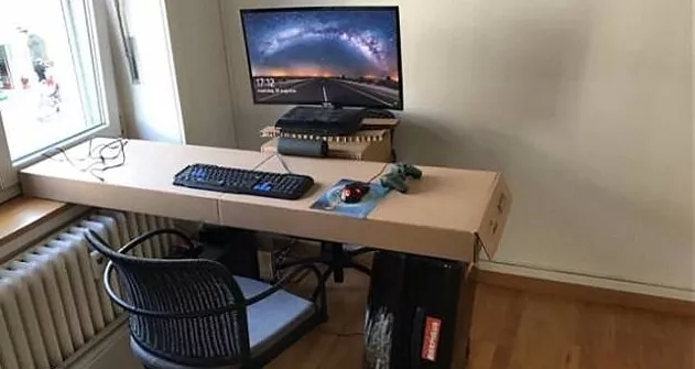 没有电脑桌也没关系,直接拿装键盘和显示器的纸箱就行...