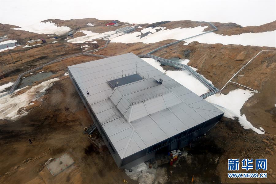 这是2017年12月31日在直升机上俯拍的巴拉提站。当地时间2017年12月31日,正在南极中山站进行度夏科考的中国第34次南极科考队派部分队员,前往印度巴拉提站进行友好访问。巴拉提站与我国中山站直线距离约12公里,采用一体式建筑结构,在各国南极科考站建筑中颇具特色。新华社记者白国龙摄