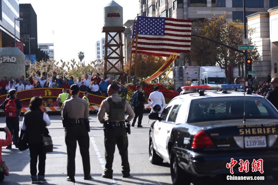 当地时间2018年1月1日上午,第129届美国玫瑰花车游行在加利福尼亚州名城帕萨迪纳市盛大登场。花车游行路程全长5.5英里,预计现场观众近百万。这是当地2018年举行的第一场大型活动,警方高度重视,大量警力部署在游行沿线以确保安全。图为科罗拉多大道游行路线旁边随处可见的洛杉矶郡警察局警员。 中新社记者 张朔 摄