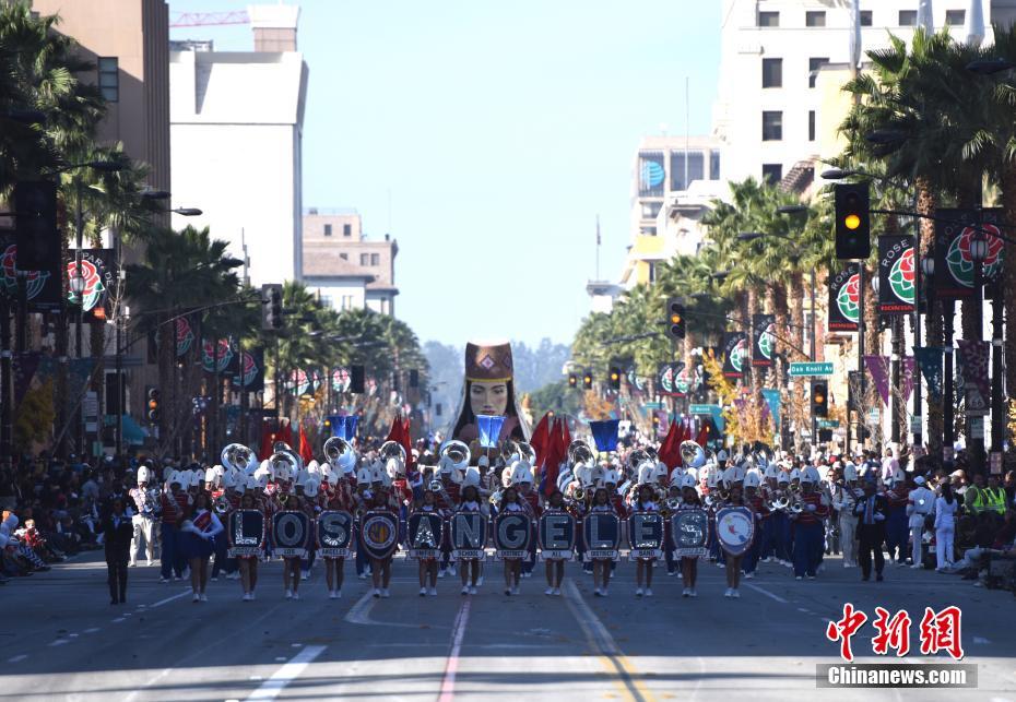 当地时间2018年1月1日上午,第129届美国玫瑰花车游行在加利福尼亚州帕萨迪纳市举行。久负盛名的美国玫瑰花车游行已有逾百年历史,与纽约时代广场新年倒计时活动齐名,是美国规模最大、吸引观众最多的新年庆典之一,2018年花车游行主题是“与众不同”。图为色彩缤纷的游行队伍走在科罗拉多大道上。 中新社记者 张朔 摄