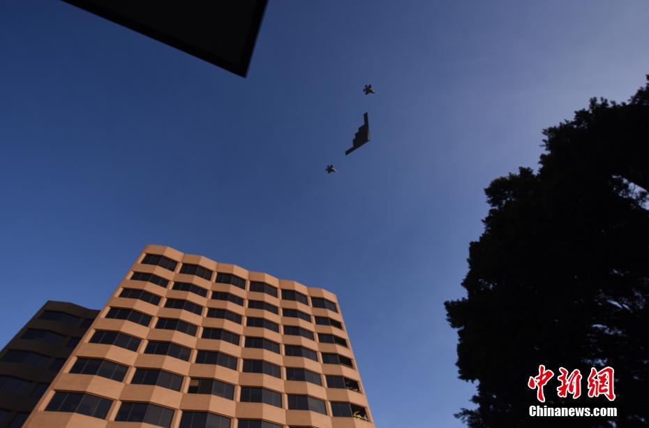 当地时间2018年1月1日上午,第129届美国玫瑰花车游行在加利福尼亚州帕萨迪纳市举行。久负盛名的美国玫瑰花车游行已有逾百年历史,与纽约时代广场新年倒计时活动齐名,是美国规模最大、吸引观众最多的新年庆典之一,2018年花车游行主题是“与众不同”。图为美国空军隐形轰炸机在游行路线低空呼啸而过,为2018年玫瑰花车游行拉开帷幕。 中新社记者 张朔 摄