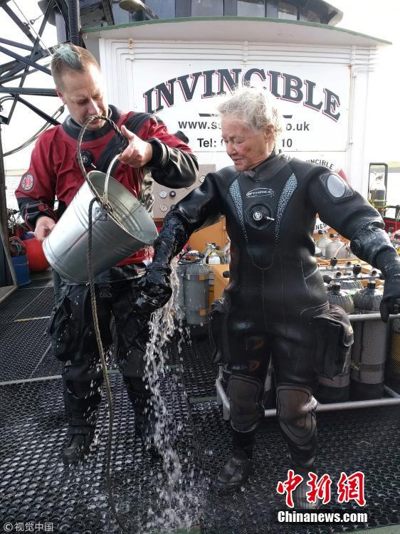 2018年1月2日讯(具体拍摄时间不详),英国斯卡帕湾,英国一位叫作帕特·冯在斯卡帕湾潜水度过了自己80岁的生日。帕特·冯是5个孩子的祖母,她选择在80岁生日时,潜水到一艘在一战中沉没的军舰残骸附近。她潜水达35米深,以此鼓励更多女性尝试这一项她深爱的运动,她从67岁开始练习潜水,曾在马尔代夫进行过潜水,在那之后,帕特还在墨西哥、加勒比海和埃及进行过潜水。图片来源:视觉中国