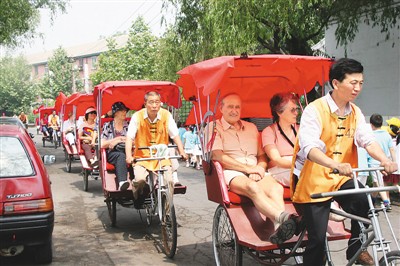 老外乘坐三轮车逛北京什刹海,成为一道亮丽的风景线。图片来自视觉中国