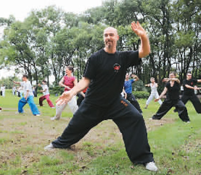 图为法国太极迷在广西桂林訾洲公园打太极。图片来自视觉中国