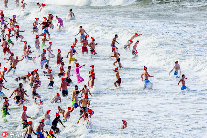 荷兰民众聚在海滩"下饺子" 扎堆冬泳庆新年