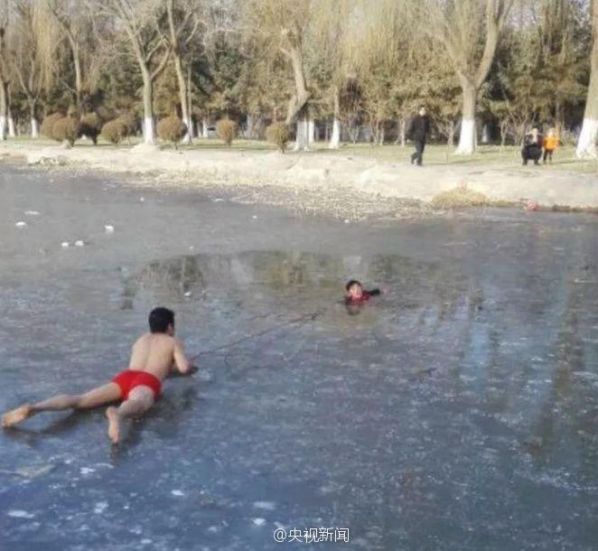 ​1月1日下午,甘肃金昌一儿童不慎落入冰窟,湖水深2.5米,孩子落水处离岸边有二三十米且冰层较薄,援救一度艰难。市民薛彦喜自告奋勇,脱去外衣匍匐在冰面和警察一起施救。