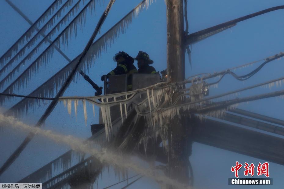 纽约一建筑发生火灾 消防员喷水致周围遭冰封