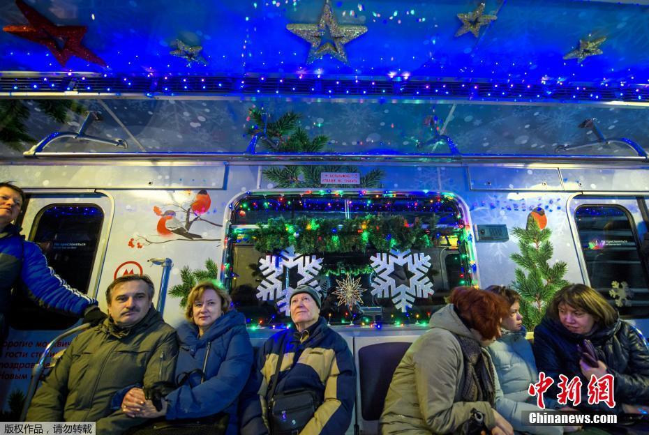 当地时间2018年1月2日,俄罗斯首都莫斯科新年彩装地铁专列开行,乘客在车厢内感受到浓郁的新年气氛。