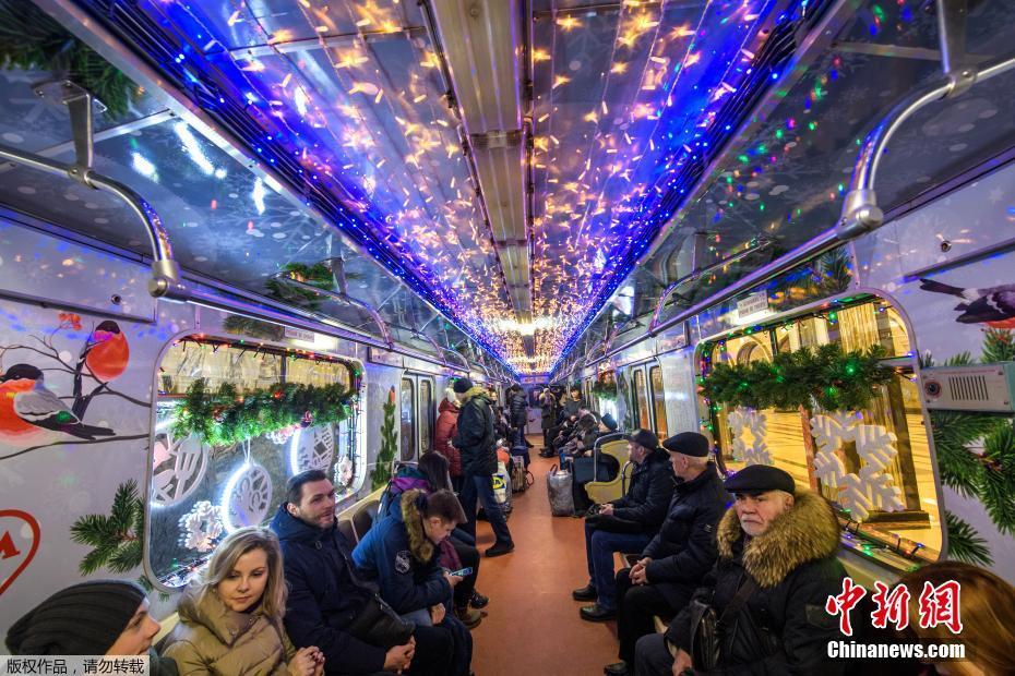 当地时间2018年1月2日,俄罗斯首都莫斯科新年彩装地铁专列开行,乘客在车厢内感受到浓郁的新年气氛。