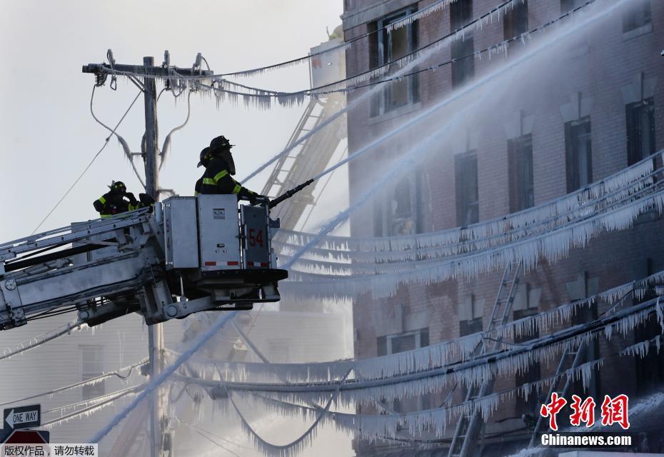 纽约一建筑发生火灾 消防员喷水致周围遭冰封
