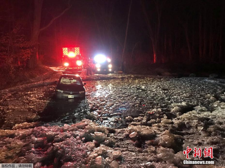 低温造成道路湿滑,引发不少交通事故。图为当地时间1月1日,马里兰州博伊兹的一辆载有3人的车滑入冰水中无法动弹,消防队展开救援。
