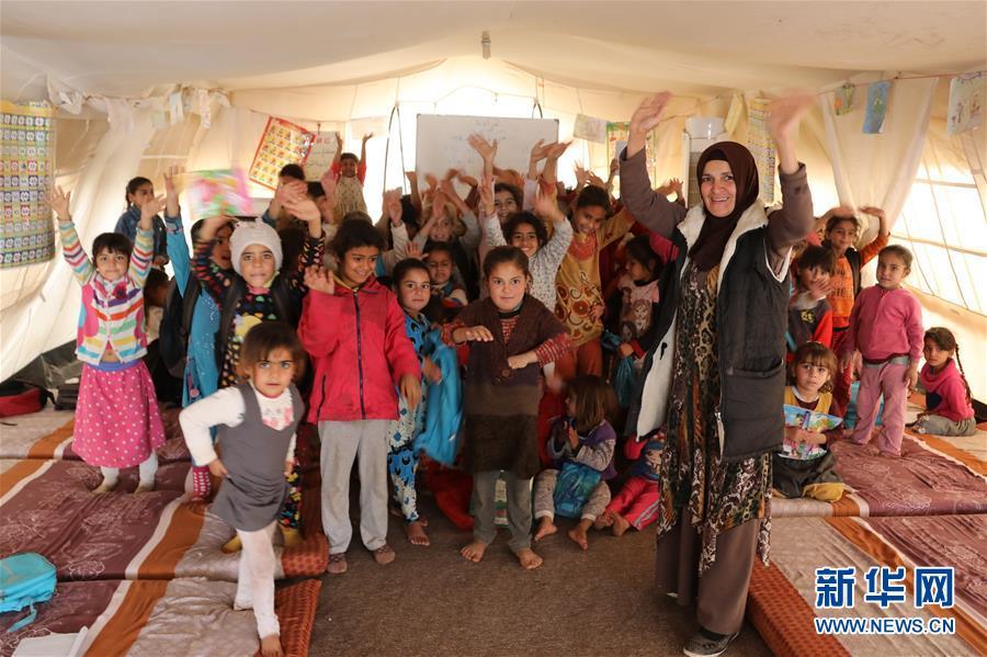 这是1月3日在伊拉克摩苏尔以东的哈济尔安置营一所帐篷教室拍摄的老师和学生。新华社发(哈利勒·达伍德摄)