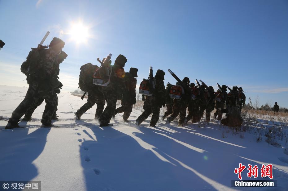 2018年1月3日,内蒙古海拉尔地区气温骤降至零下30度,当日,武警呼伦贝尔市森林支队组织全体官兵冒着严寒进行野外拉练,锤炼官兵耐寒和适应恶劣环境的能力,有效提升部队战斗力。 图片来源:视觉中国