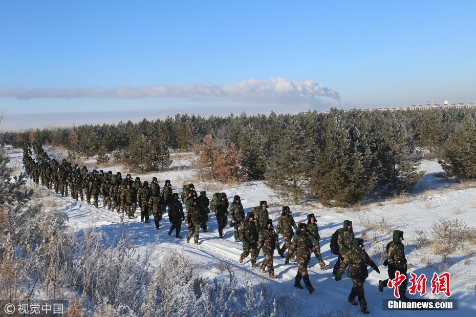 2018年1月3日,内蒙古海拉尔地区气温骤降至零下30度,当日,武警呼伦贝尔市森林支队组织全体官兵冒着严寒进行野外拉练,锤炼官兵耐寒和适应恶劣环境的能力,有效提升部队战斗力。 图片来源:视觉中国