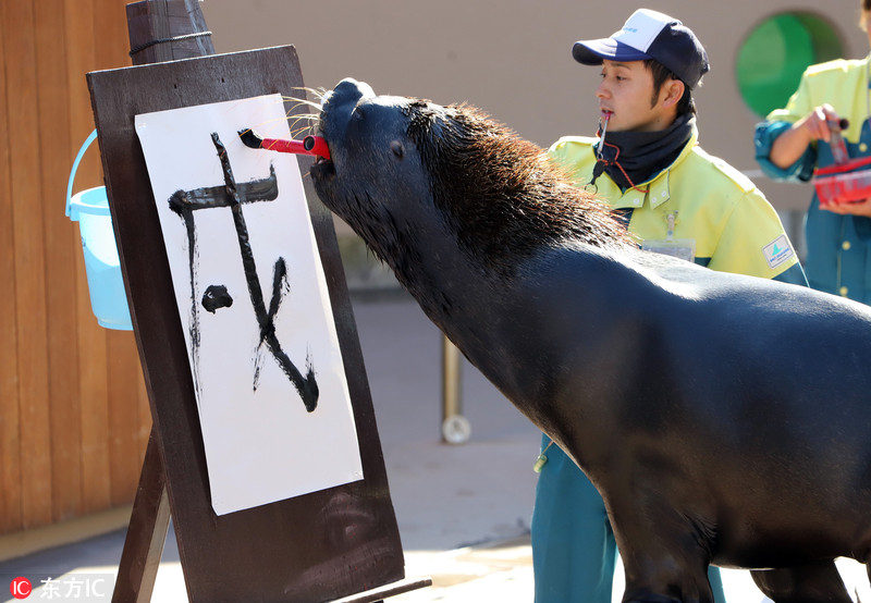 当地时间2018年1月3日,横滨,横滨八景岛海洋公园,14岁的雄性海狮Chen咬笔书写汉字“戌”,庆祝2018中国农历狗年的到来,吸引游客关注。