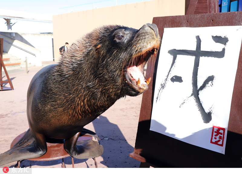 当地时间2018年1月3日,横滨,横滨八景岛海洋公园,14岁的雄性海狮Chen咬笔书写汉字“戌”,庆祝2018中国农历狗年的到来,吸引游客关注。