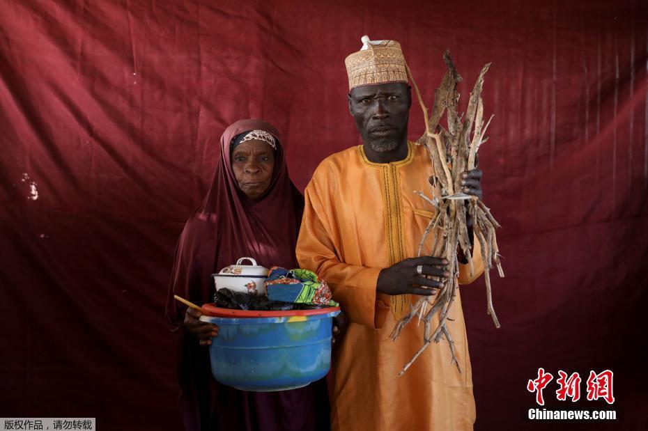 Aisha Umaru(左)手举一盆牛奶与此同时Umari Usman Kaski 手拿一堆柴火。