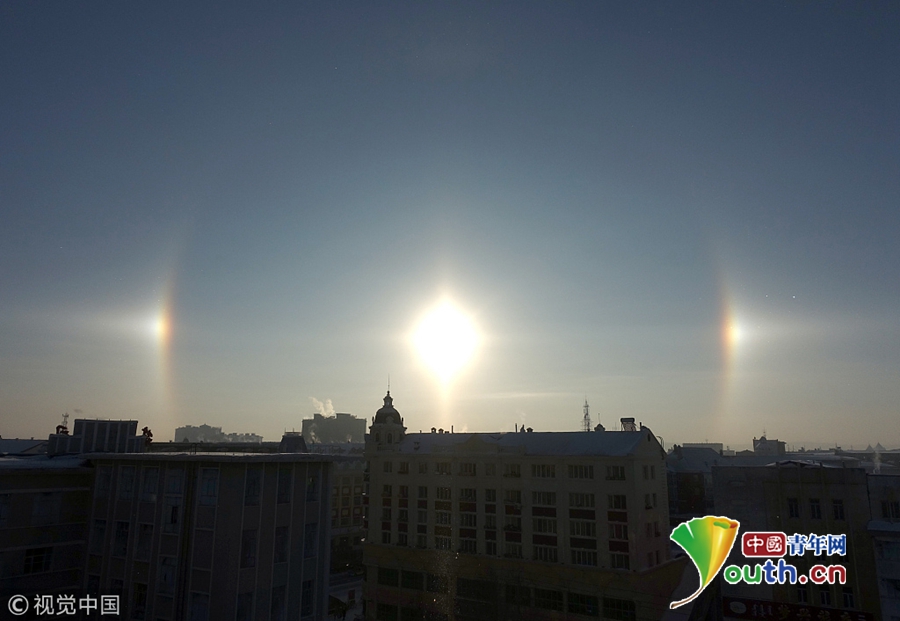 ​2018年1月4日,内蒙古呼伦贝尔牙克石天空出现“三个太阳”奇观。据呼伦贝尔气象台工程师赵可新介绍,这是大气经阳光折射出现的物理现象,一般在呼伦贝尔寒冷的冬季才出现。当日,牙克石最低气温零下33度。