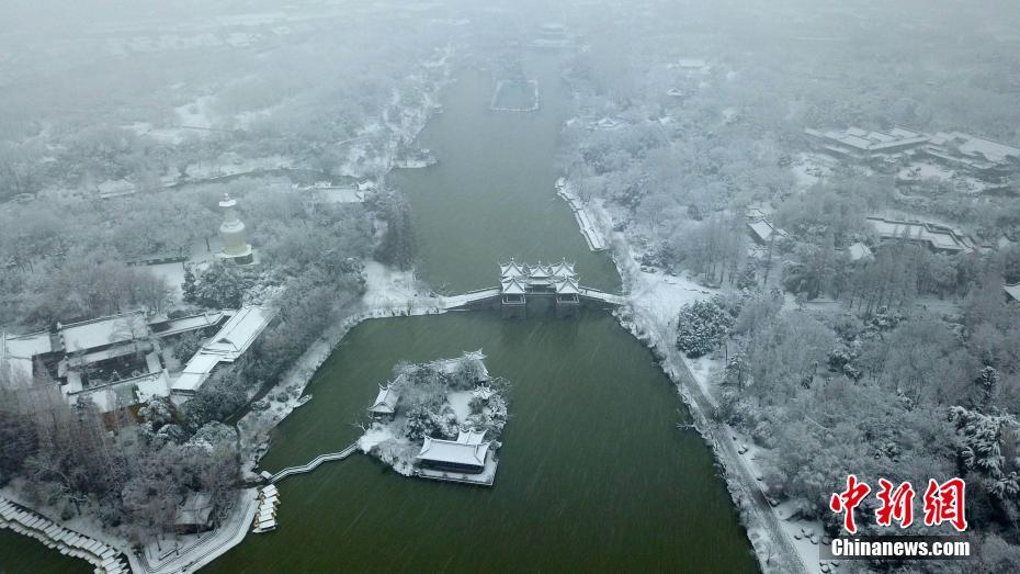 1月4日,古城扬州雪花纷飞,迎来今年首场降雪,城市的各大公园、景点,从高空俯瞰,呈现出一幅银装素裹的北国景象,如同一幅美丽的画卷,很多市民走出家门,欣赏雪景。图为雪中的瘦西湖分外妖娆。 孟德龙 摄