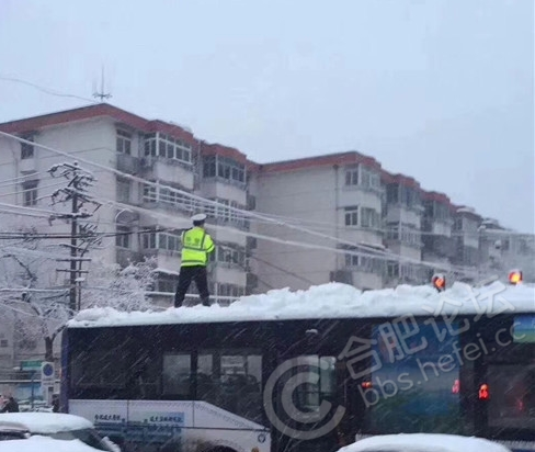 随后,交警又找到杆子将电缆撑起,确保了道路通行安全。图为交警在雪中托举被压落电缆。