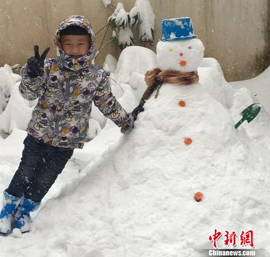 图为河南信阳小朋友与雪人合影。 韩章裔 摄