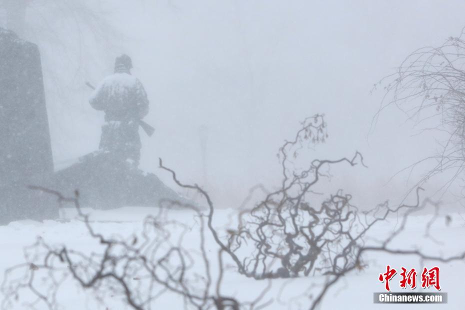 当地时间1月4日,暴雪中纽约法拉盛公园中的雕塑。当日,纽约降下2018年首场暴雪。受一波被称为“炸弹气旋”的风暴影响,美国东北部地区当天普遍遭受暴雪袭扰,3000多个航班因此取消。中新社记者 廖攀 摄