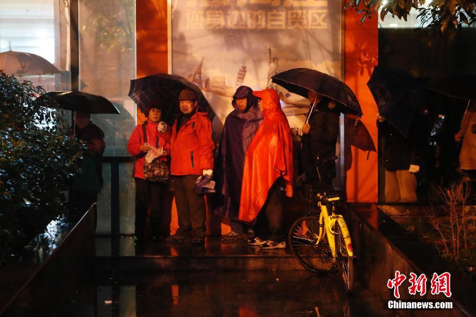 1月5日,在上海浦东南路5000号中国邮政世博邮政支局营业厅外,民众冒雨通宵排队购买《戊戌年》特种邮票。此次中国邮政发行《戊戌年》特种邮票1套2枚。图案内容分别为:犬守平安、家和业兴。全套邮票面值为2.40元。中新社记者 殷立勤 摄