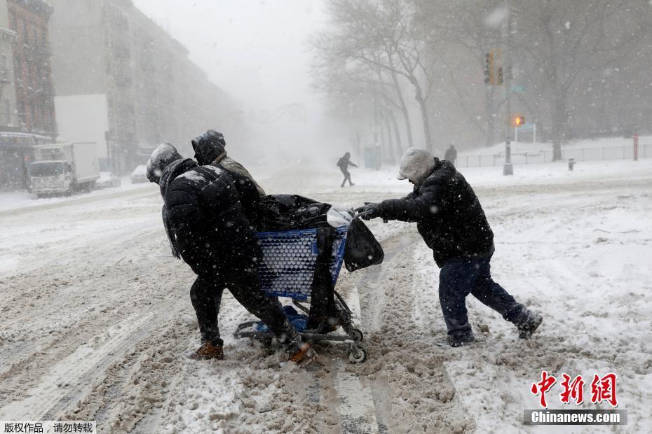美国国家气象局预计,此轮大范围降雪将于周四下午至夜间逐渐减弱消散,但随之而来的是大风降温,未来三天美国东北部地区都将面临严寒。纽约市本周末最低气温可达摄氏零下19度。图为曼哈顿“上城区”的居民在暴雪中艰难出行。